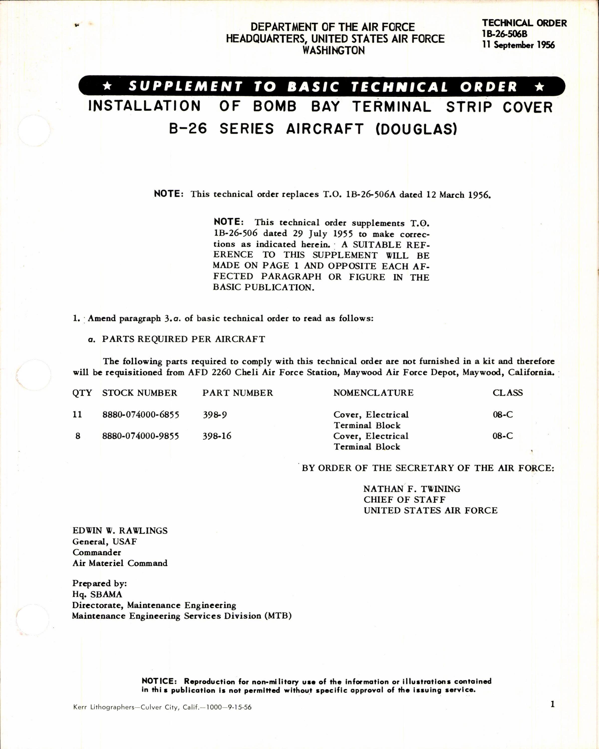Installation of Bomb Bay Terminal Strip Cover B-26 Series, T.O. No. 1B-26-506B, 11-Sept-1956