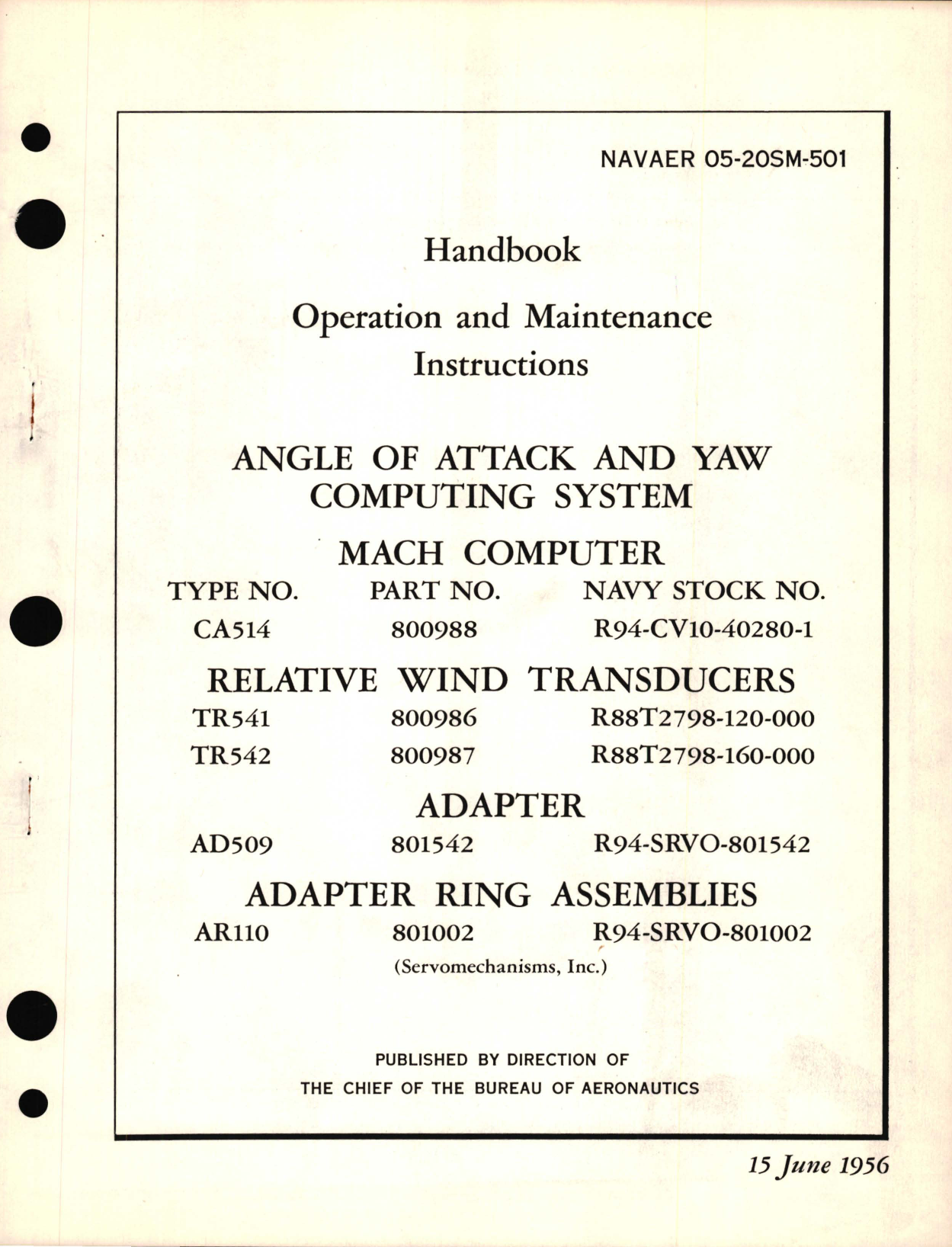 Operation and Maintenance Instructions for Angle of Attack and Yaw Computing System MACH Computer Type No. CA514, TR542 Part No. 800986, 800987, Adapter Type No. AD509, Part No. 801542 Adapter Ring Assemblies Type No. AR110 Part No. 801002, NAVAER 05-20SM-501, 15-June-1956