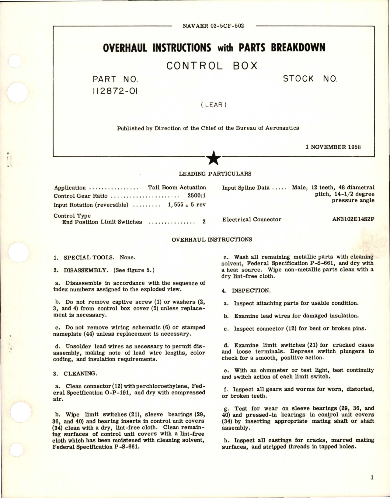 Overhaul Instructions with Parts Breakdown for Control Box - Part 112872-01 , NAVAER 03-5CF-502, 1-Nov-1958, FWAM