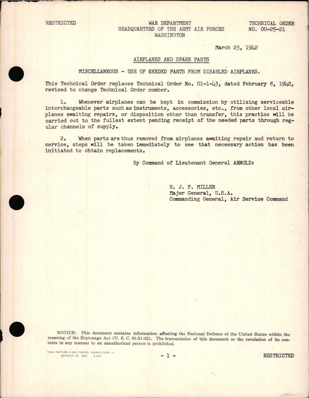 Airplanes and Spare Parts, T.O. No. 00-25-21, 23-Mar-1942