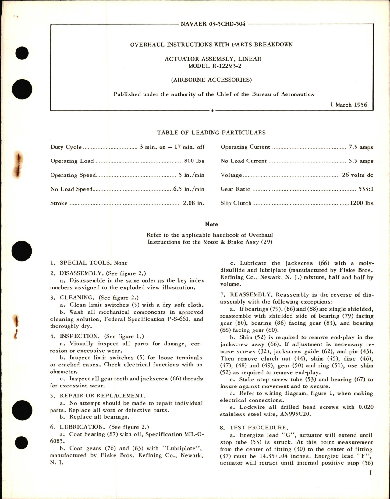 Overhaul Instructions with Parts Breakdown for Actuator Assembly and Linear Model R-122M3-2, NAVAER 03-5CHD-504, 1-Mar-1956