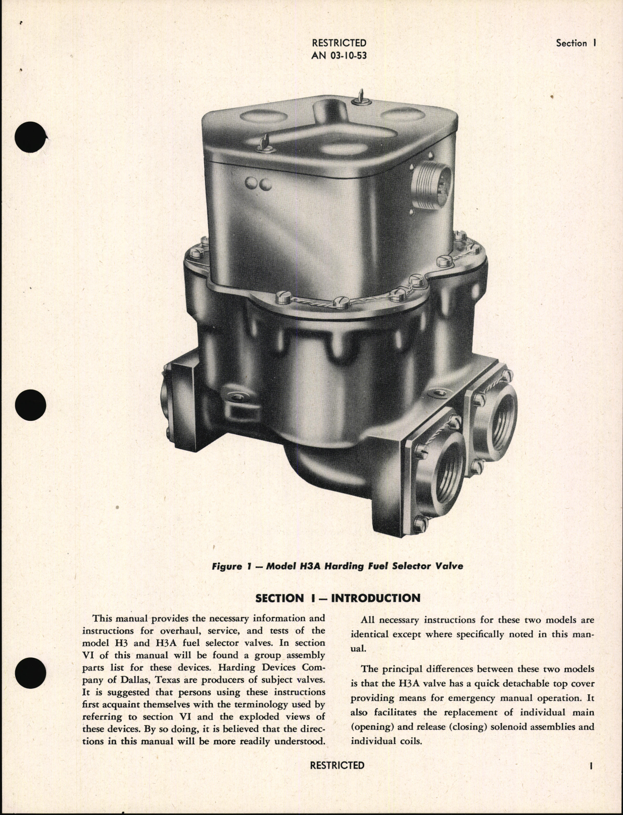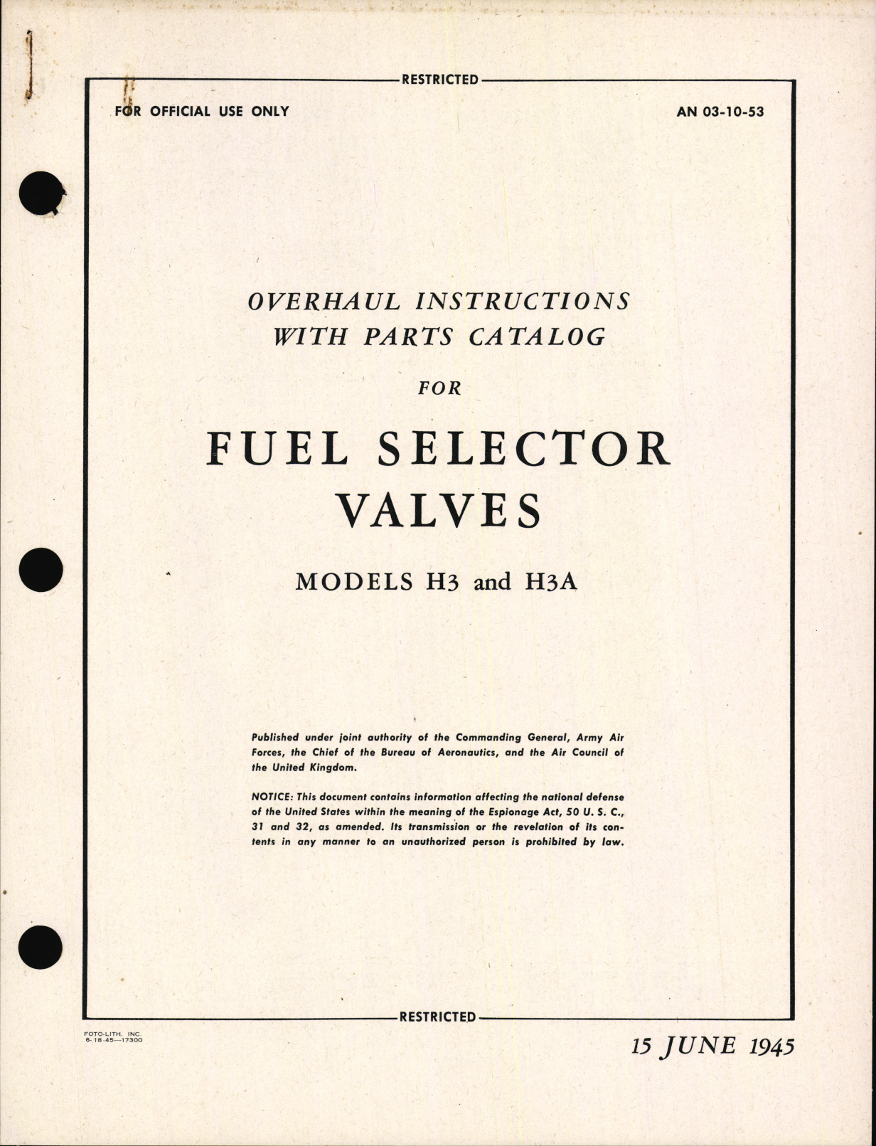 Overhaul Instructions with Parts Catalog for Fuel Selector Valves Models H3 and H3A, AN 03-10-53, 15-June-1945