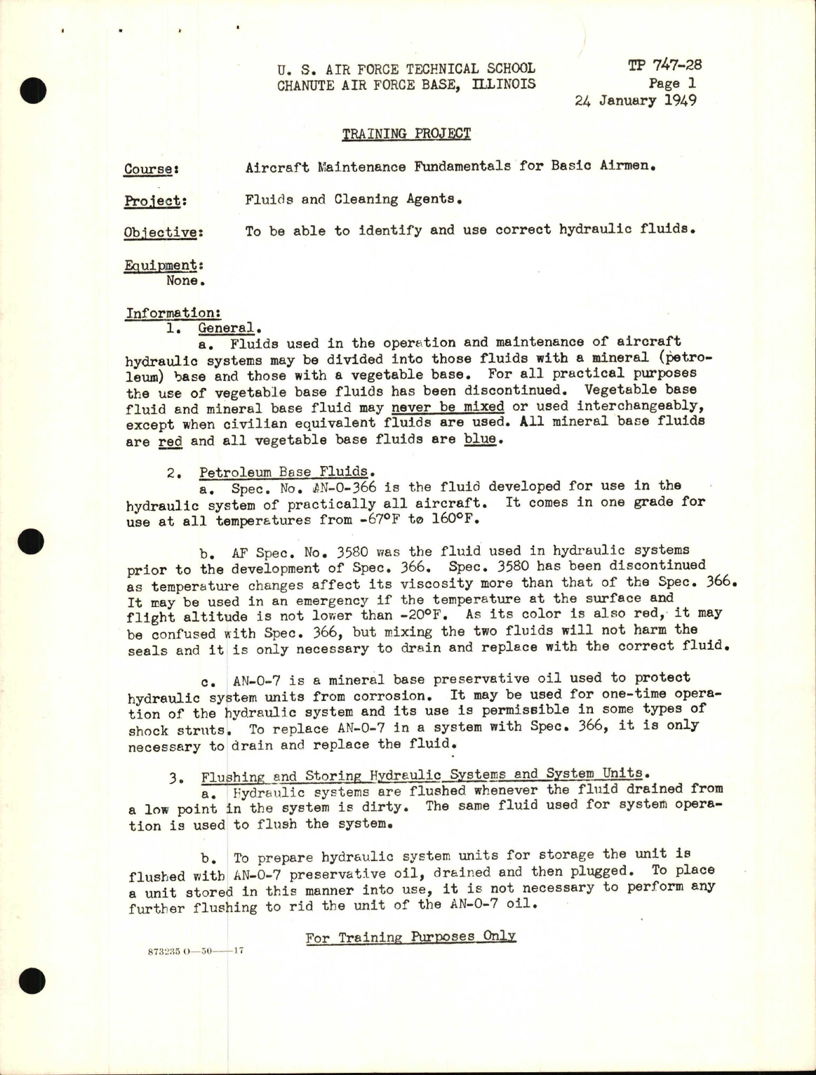 Training Project, Fluids and Cleaning Agents, TP 747-28, 24-Jan-1949