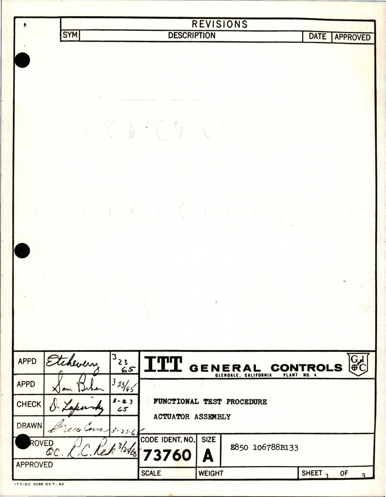 Functional Test Procedure for Actuator Assembly, No. E850-106788B133, Mar-1965