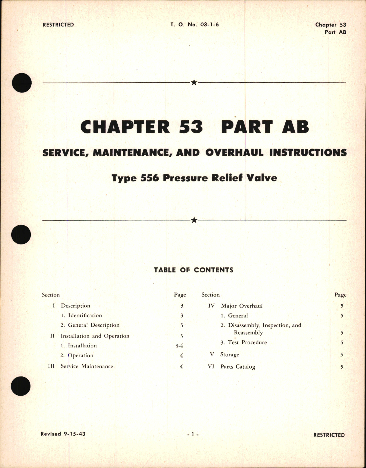 Service, Maintenance and Overhaul Instructions for Pressure Relief Valve Type 556, Ch 53 Part AB, T.O. No. 03-1-6, 15-Sept-1943